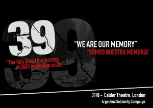 | Luego del estreno, el pasado viernes 18 de agosto en la sede de Directores Cinematográficos Argentinos (Vera 559), “39, El Documental”, se presenta en Londres. Una realización que por primera vez habla de las 39 personas asesinadas el 19 y 20 de diciembre del 2001.A más de quince años de la crisis política, social y económica que sacudió a la Argentina, el film presenta los testimonios de los familiares y amigos de las 39 víctimas que en un 80 % no superaban los 30 años, y de los cuales 10 eran menores de edad. El equipo periodístico recorrió el país durante un año en busca de los testimonios que fueron invisibilizados durante este período, con la intención de dar a conocer sus historias de vida y de denunciar la impunidad que, hasta hoy día, recorre algunos de los casos. A su vez, el film respalda, con un importante material de archivo, el recorrido que hizo la Argentina para terminar en un estallido social.Luego de su estreno en Buenos Aires, al que asistieron familiares de las víctimas de Córdoba, Entre Ríos, Corrientes y Santa Fe, la película se proyectará en la ciudad de Londres en los espacios Argentina Solidarity Campaign y Alborada. Además se harán presentaciones en universidades y centros culturales de distintas ciudades del país.Con el debut de Ayelén Velazquéz como directora, la producción general de Celeste del Bianco, María Luz Coronel y Paula Schrott, el documental cuenta con la participación de Iván Noble en la presentación de testimonios.Cuatro periodistas mujeres que rinden homenaje a las 39 víctimas de la represión y hacen un llamado a la memoria de toda la sociedad argentina.Contacto: 39documental@gmail.com