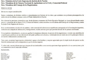 «Asistimos con profunda preocupación a la embestida de las últimas semanas contra el Poder Judicial de la Nación», comienza la epístola. «Nos alarman las presiones sistemáticas que, desde distintos estamentos del Poder Ejecutivo Nacional, se vienen desarrollando contra jueces y camaristas de los fueros Civil y Comercial Federal, contra miembros no oficialistas del Consejo de la Magistratura y contra la propia Corte Suprema de Justicia», alegan.