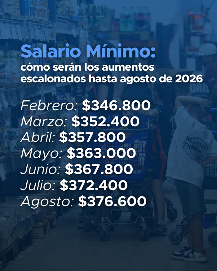 El Consejo Nacional del Empleo, la Productividad y el Salario Mínimo, Vital y Móvil (SMVM) determinó una nueva escala de actualizaciones para todo el país, con aumentos escalonados desde noviembre de 2025 hasta agosto de 2026. De esta manera, en febrero alcanzará los $346.800.