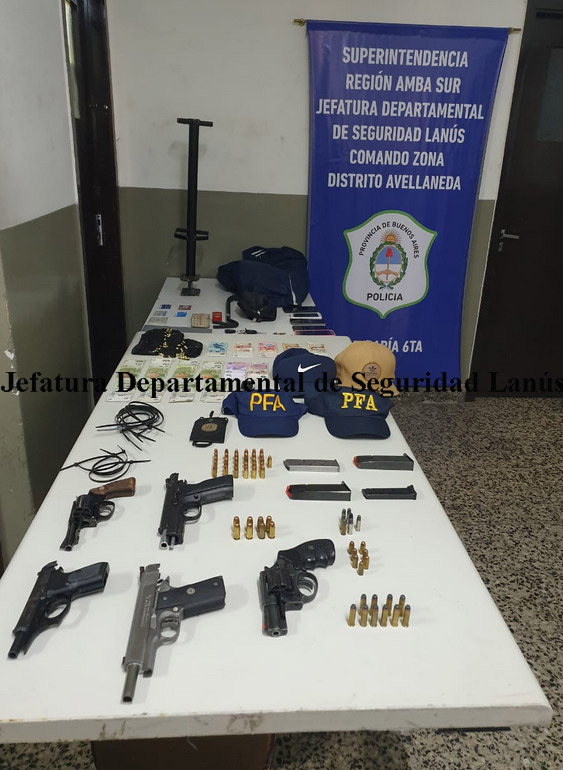 Un móvil del Comando de Patrullas de Avellaneda, concurrió a un llamado al 911 que denunciaba una entradera en un domicilio de la calle José Ingenieros al 500 y al arribar visualizaron un auto de color negro en marcha con un ocupante en su interior por lo que solicitaron apoyo, una vez que arribaron otros móviles ordenaron descender al ocupante el que llevaba un chaleco de transporte policial y dijo que eran policías de Quilmes, pero terminó aprehendido al igual que el resto de la banda que en tandas salieron del domicilio, todos portaban partes de vestimentas policiales y estaban armados, la víctima resulto ilesa.