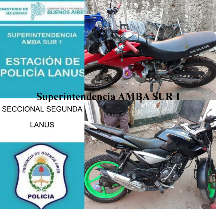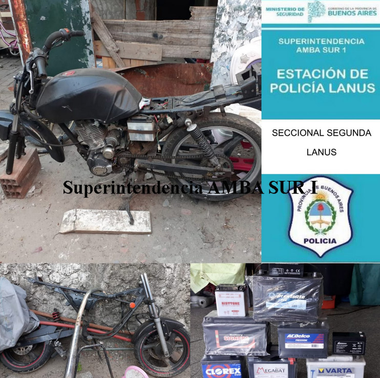 Objetivo 01: ddo. Lacarra al 400 Gerli. Aprehensión de CHUQUIMIA Oscar Alberto (argentino, 45 años); de CHÁVEZ Víctor Raúl (argentino, 27 años); y de MARTÍNEZ Horacio Emilio (argentino, 30 años). Al secuestro de: moto Honda Titán roja; cuadro de motocicleta negra, moto Bajaj Rouser negra, moto Honda IBR negra (desarmada); moto Zanella 250 roja; sin patentes y con numeración de cuadro y motor adulterada; y la cantidad de seis baterías de vehículo y tres de motocicletas .