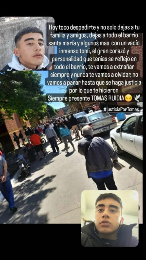 Otros de los posteos en la red social Facebook expresa: “Hoy tocó despedirte y no solo dejas a tu familia y amigos, dejas a todo el barrio Santa María y algunas más con un vacío inmenso, Tomy. El gran corazón y personalidad que tenías se reflejó en todo el barrio. Te vamos a extrañar siempre y nunca te vamos a olvidar. No vamos a parar hasta que se haga justicia por lo que hicieron. Siempre presente Tomás Ruidia”.