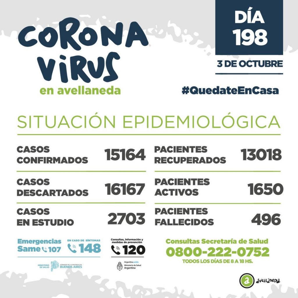 Dentro de los 15.147 casos se encuentran los 13.016 vecinos ya recuperados y los 494 decesos, informados por el Municipio de Avellaneda. La cartera sanitaria bonaerense dejó de informar los decesos por distrito el pasado fin de semana y luego de agregar 3.500 por el cambio en el registro.
