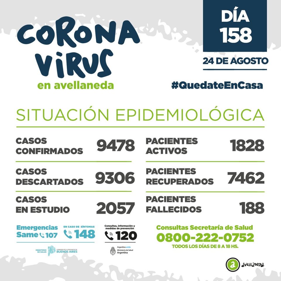 El Ministerio de Salud de la provincia de Buenos Aires confirmó diez nuevos decesos y 177 contagios en Avellaneda, por lo que ya son 188 las víctimas fatales y 9.478 los infectados en el distrito desde el inicio de la Pandemia.