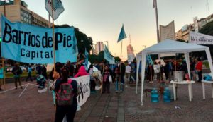La organización, que programa los bloqueos para el mediodía, instaló a las 7 cinco gazebos blancos y una olla popular en la Plaza de la República, frente al Obelisco, donde unos 250 integrantes de la agrupación agitaban banderas de Barrios de Pie.