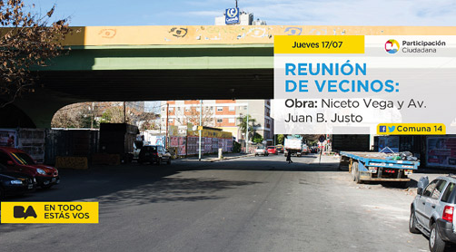 Querido vecino, te invitamos desde Participación Ciudadana, a participar este Jueves 17/07 de la primera reunión vecinal por Entorno Juan B. Justo y Niceto Vega (Av. Juan B. Justo y Av. Cnel. Niceto Vega – Comuna 14 Buenos Aires).