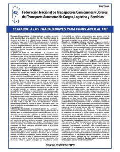 Con una dura solicitada en los principales diarios del país, la Federación Nacional de Choferes de Camioneros denunció al gobierno de Mauricio Macri por “el ataque a los trabajadores para complacer al FMI”.