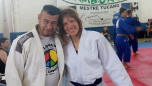 4: Tuviste un serio problema médico y lo llevaste adelante entre otras cosas por el deporte { judo }, contános de esto. En diciembre de 2016, en una mamografía de control, detectaron unas lesiones que no eran normales. Me realizaron la biopsia y a los 15 días tenía el diagnóstico de cáncer de mama (adenocarcinoma microinvasivo en mama derecha). Gracias a la prevención temprana, solamente tuve cuadrantectomía sin vaciamiento axilar, ganglios negativos, ganglio centinela negativo y márgenes de seguridad negativos. Muy buenas noticias. Debo confesar que después de la cirugía lo primero que le pregunté al cirujano fué por el vaciamiento axilar, ya que si me lo realizaban el reposo era de varios meses más. Y quería volver enseguida. Apenas me dieron el alta, volví al dojo. Las primeras tres quimios, (ciclofosfamida), me daba náuseas y dolor abdominal. Pero como me las realizaba los viernes, para el martes que volvía al tatami estaba mucho mejor. Además eran cada 21 días. LA segunda parte, fueron 12 sesiones de paquitlaxel. Por tres meses. Acá, el peor efecto adverso eran las parestesias en la manos. Dolor y pinchazos en los dedos principalmente. Esos días que usaba pantalón en vez que calzas porque dolían los dedos y se rompían las uñas ante el roce. Digamos que este dolor en dedos no es compatible con agarrar un judogui. Pero prefiero el dolor de agarrar el judogui. Mis randoris duraban a veces 30 segundos y debía parar a descansar y volvía. Pero se terminaron todos. Y como mujer, lo más difícil fué la caída del cabello, estar pelada y después con peluca no es lindo para una mujer, lo mismo que verte sin cejas ni pestañas. sos otro rostro, otra persona. Pero en el tatami la belleza pasa a segundo plano. La peluca estuvo varias veces a punto de volar y salirse, pero era el momento que menos me importaba. En las olimpíadas médicas, competí también en natación y gané tres medallas (plata en la general, oro en categoría mujeres, salí tercera en todas las carreras mixtas y gané la carrera de postas. Y por primera vez en mi vida, me tiré en paracaídas. Volé en Brasil y esa sensación de libertad de adrenalina y de locura, es única. El cáncer me hizo fuerte. Me hizo libr. e. Me hizo saber lo que quiero y lo que no. Me hizo priorizarme. Me hizo quererme. Me hizo crecer. Y eso me trajo felicidad. Y en el fondo agradezco estas pruebas para ser quien quiero ser y hace lo que quiero hacer. Quiero agradecer a mi sensei y mis compañeros de judo por la paciencia, pero por sobre todo por nunca dejarme caer ni abandonar… Aunque eso nunca estuvo en mis planes. Una vez le dije a una judoca «me vas a ganar vos, no la quimio». Nunca me ganó.