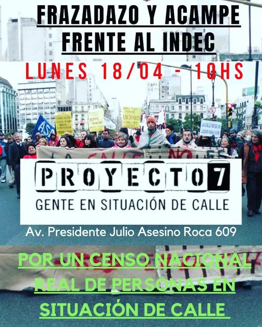 “Por un censo nacional real de personas en situación de calle. Cansades de no existir, cansades de que nos desaparezcan, de que sólo hagan ´conteos´ o ´fotos´ sobre la población en situación de calle del país, movilizamos y acampamos frente al Indec”, señala la convocatoria.