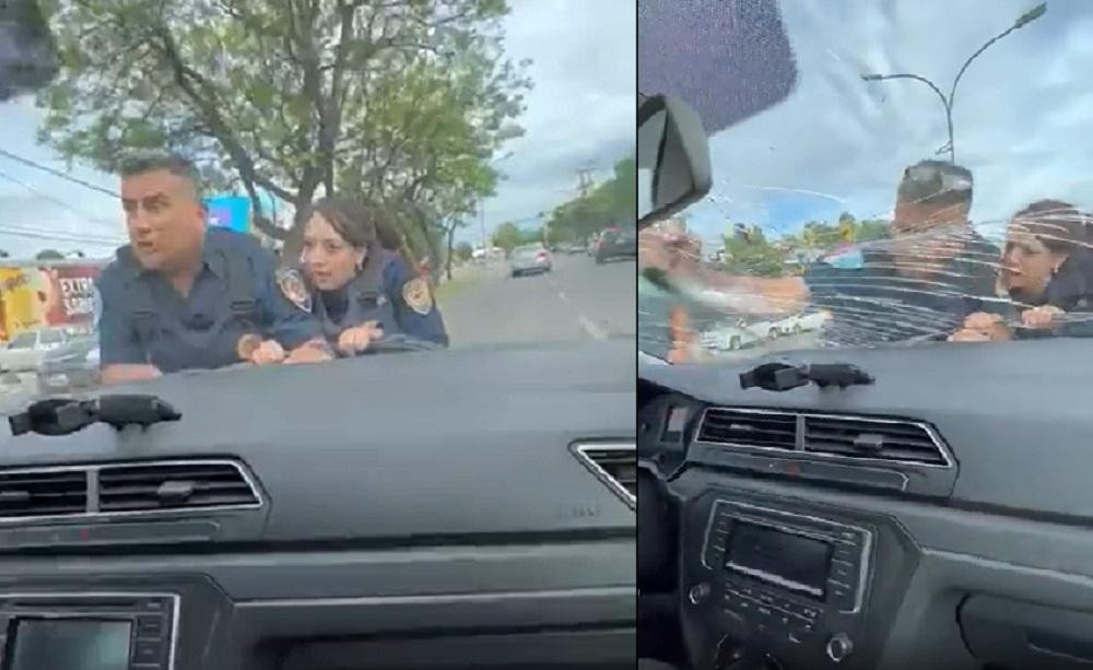 Fue cuando el conductor decidió arrancar el vehículo y los policías se aferran al capot: «¡Frená! ¡Frená, hijo de puta!», gritó uno de los uniformados, que terminó lesionado en una de sus piernas cuando el auto realizó una brusca frenada.