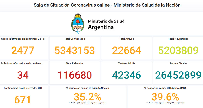 Otras 34 personas murieron y 2.477 fueron reportadas con coronavirus en las últimas 24 horas en la Argentina, con lo que suman 116.680 los fallecidos registrados oficialmente a nivel nacional y 5.340.676 los contagiados desde el inicio de la pandemia, informó este lunes el Ministerio de Salud.