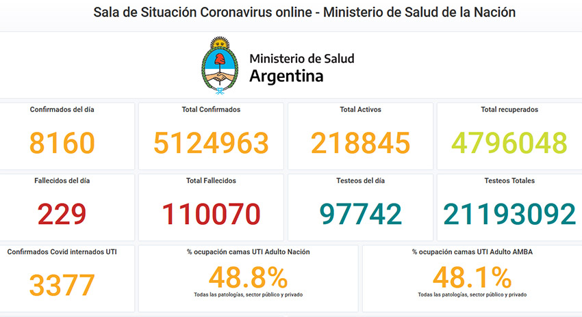 El Ministerio de Salud reportó 229 muertes por coronavirus en las últimas 24 horas con lo que suman 110.070 los fallecidos en todo el país. Además se detectaron 8.160 contagios por lo que ascendieron a 5.124.963 los infectados desde el inicio de la pandemia.