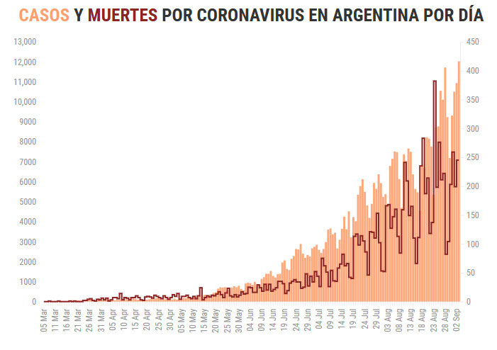 En las últimas 24 horas, 245 personas murieron y se produjo un pico de 12.026 contagios de Coronavirus en la Argentina, de manera que suman 9.361 los fallecidos y 451.198 los infectados desde el inicio de la Pandemia, informó este jueves el Ministerio de Salud.