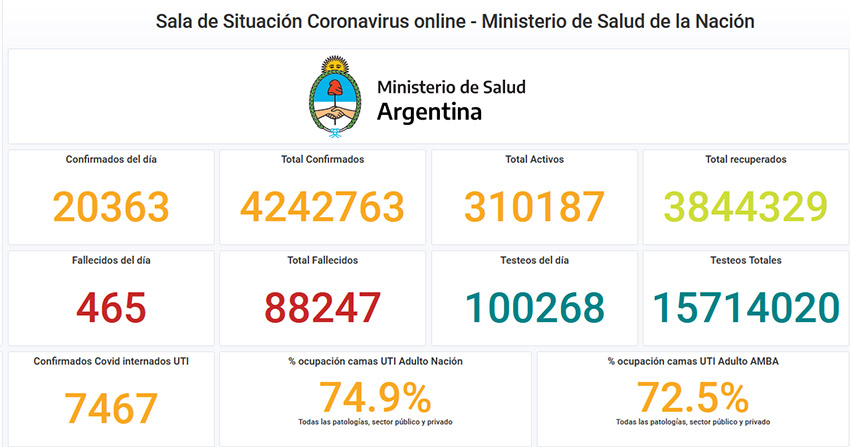 El Ministerio de Salud anunció que 465 personas murieron y 20.363 fueron reportadas con coronavirus en las últimas 24 horas en la Argentina, con lo que suman 88.247 los fallecidos registrados oficialmente a nivel nacional y 4.242.763 los contagiados desde el inicio de la pandemia.