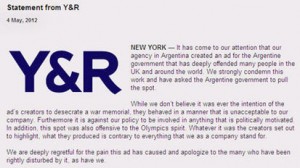 «Condenamos enérgicamente este trabajo y ya hemos pedido al gobierno argentino que levante el spot», dice el comunicado de la casa matriz de Young & Rubicam. Además destaca que mucha gente en Inglaterra «se sintió muy ofendida» por la campaña.