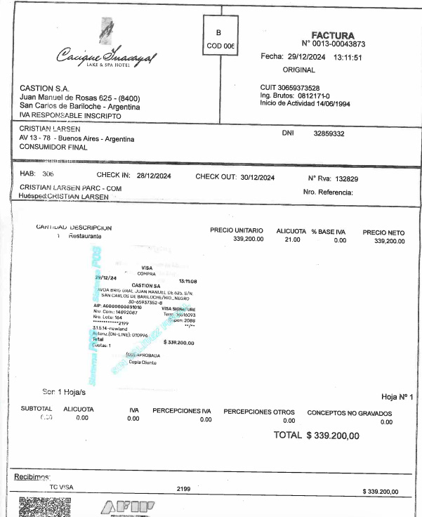 Sin embargo el plato fuerte llegó el 29 de diciembre. Casi en sintonía para darle retuit a un posteo que lo muestra «encabezando» las tareas para combatir el incendio, Larsen llegó hasta el lujoso Cacique Inacayal, frente al imponente lago. Allí parece que no se detuvo a ver los precios, porque el total del almuerzo fue de 392 mil pesos. Después vino del postre y el café ni siquiera estuvo de nuevo por la zona: a las 15 horas embarcó para tomarse el avión de Aerolíneas Argentinas rumbeando a Buenos Aires.