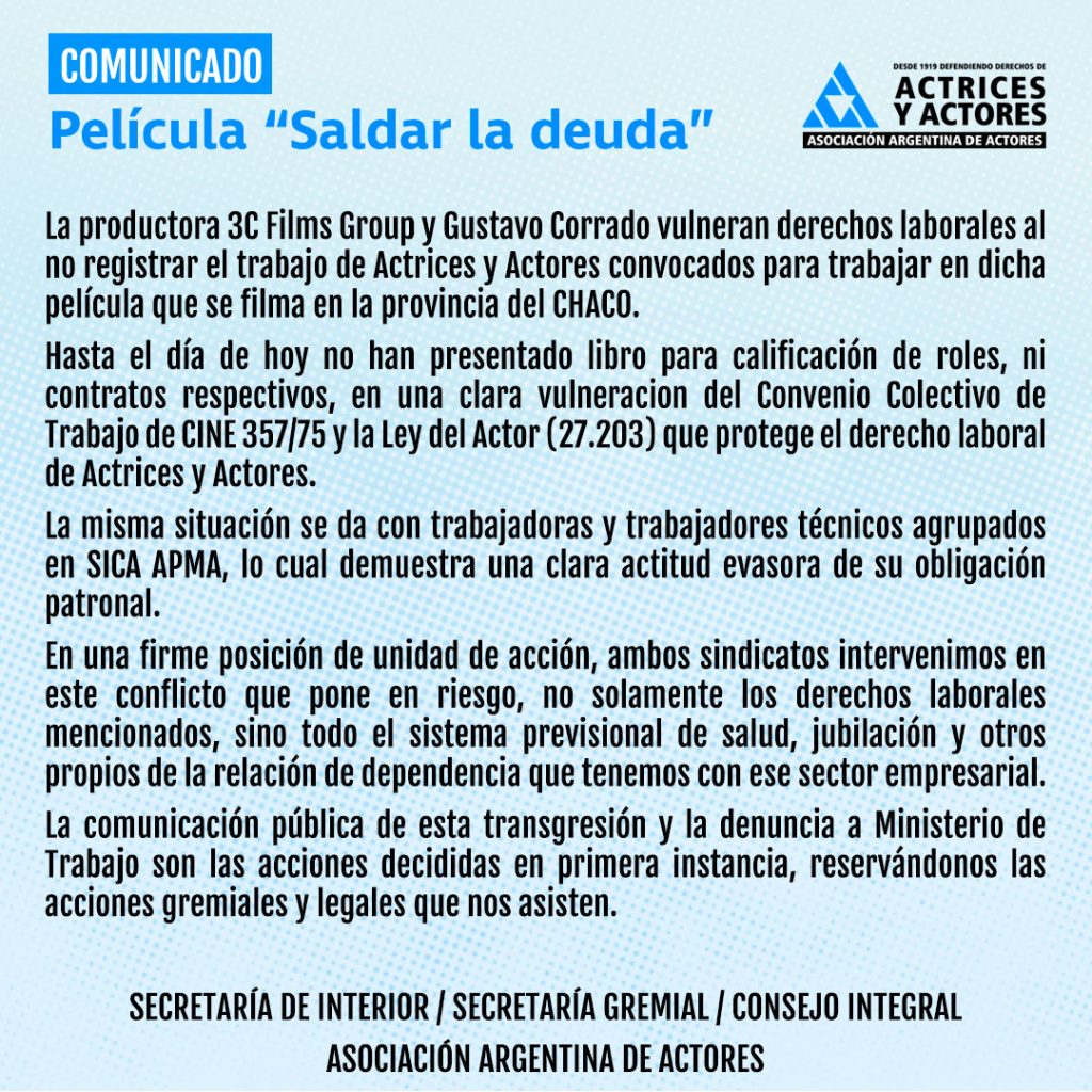 La productora 3C Films Group y Gustavo Corrado vulneran derechos laborales al no registrar el trabajo de Actrices y Actores convocados para trabajar en dicha película que se filma en la provincia del CHACO.