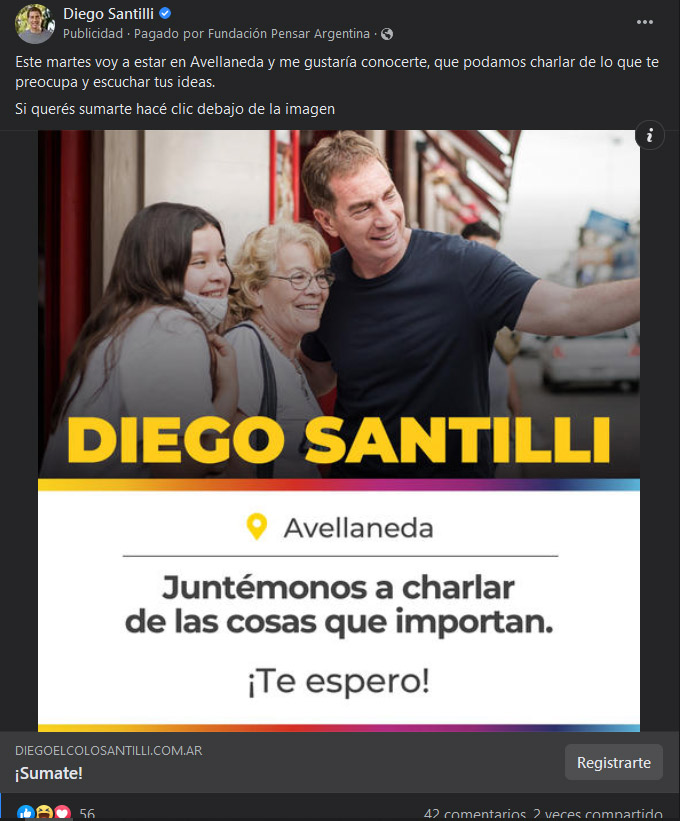 Diego Santilli, en sus cuentas de las redes sociales publica una invitación a los vecinos de Avellaneda, para reunirse hoy martes 12 de abril en un lugar que no menciona y para asistir las publicaciones derivan a un formulario online con una extensa lista de ítems a completar que superan por mucho al cuestionario de Milei que generó reacciones y denuncias incluso de los propios macristas.