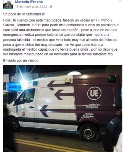 Gracias a la información que brinda el Foro Vecinal de Avellaneda Segura, hemos podido saber que el día 15 de mayo del corriente año pasadas las 00:00 usted concurrió a un domicilio de Humberto Primo y Galicia donde se esperaba un médico que constate el óbito, si bien no era una emergencia la familia y la policía debió esperar varias horas el arribo de la ambulancia, pero lo que se destaca y ha quedado resgistrado es la mala predisposición de su parte, incluso los vecinos confirmaron que no fue muy sensible con el nieto del fallecido a pesar de que este fue educado, uno entiende que la profesión de médico hace que generalmente la muerte sea algo cotidiano, pero eso no es una excusa para no comprender el dolor de los familiares y si no lo comprende tener respeto.