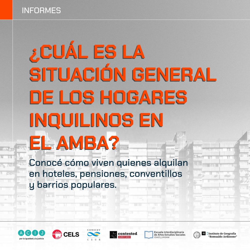 | Además, el 30% de los hogares inquilinos en barrios populares destinan más del 50% de sus ingresos al pago del alquiler. Esta tendencia se profundiza según el género del principal sostén del hogar: el 38% de los hogares de jefatura femenina destinan la mitad de los ingresos al alquiler, contra el 21% de los de jefatura masculina. En la Ciudad de Buenos Aires, el 22,7% manifestó que percibe el subsidio habitacional, siendo una práctica menos utilizada en los conventillos (13,3%) que en los hoteles (26,2%). La mitad de estos casos realizó un amparo judicial para obtenerlo, tanto por la negación en una primera instancia como para poder obtener un monto adecuado al valor de lo que pagan. El 72% de quienes perciben el subsidio admitió que el monto es insuficiente para el pago del alquiler de la pieza. El estudio se desarrolló a través de encuestas presenciales realizadas a personas inquilinas de villas y asentamientos de CABA y el GBA y a personas inquilinas que residen en inquilinatos, hoteles familiares o pensiones de CABA. Este proyecto se desarrolla en el marco de la Red Contested Territories, con el objetivo de poder conocer y comparar a nivel internacional la realidad de los hogares inquilinos en diversas ciudades, y representa una continuidad de los relevamientos previos realizados por el CELS y la EIDAES en 2020 y 2021. EL análisis fue realizado por la Asociación Civil por la Igualdad y la Justicia (ACIJ), el Centro de Estudios Legales y Sociales (CELS), el Centro de Estudios Urbanos y Regionales (CEUR/CONICET), la Escuela Interdisciplinaria de Altos Estudios (EIDAES) y el Instituto de Geografía de la UBA. |