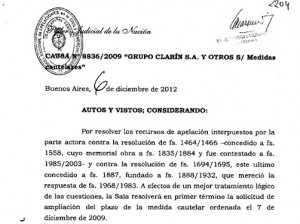 Fallo dictado esta noche por la Sala I de la Cámara Nacional de Apelaciones en lo Civil y Comercial Federal, en respuesta a la presentación del Grupo Clarín.