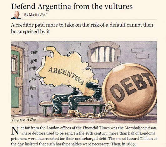 El editor del Financial Times Martin Wolf alertó que «si Argentina es obligada a pagar a los holdouts en su totalidad, el precio será cargado por los argentinos».