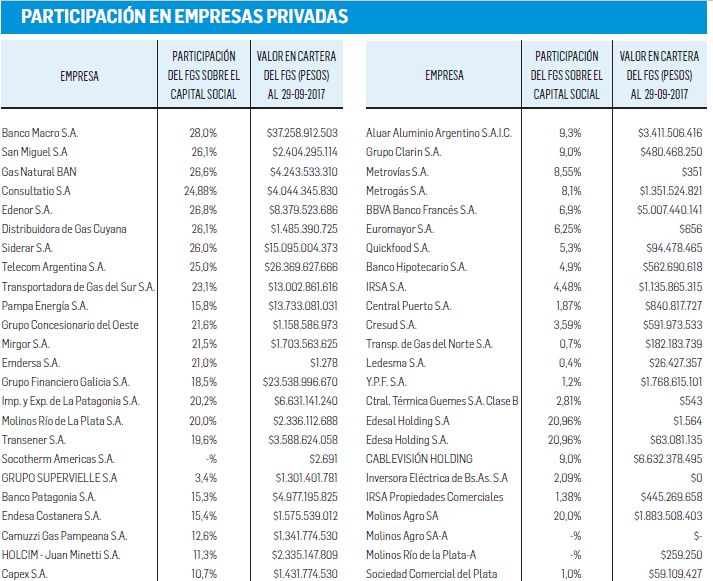 Por el sector privado se afirma que hay, desde siempre, seis ofertas concretas de grandes empresas que operan en el país que quieren recomprar las acciones que en algún momento estaban en manos de las AFJP y desde la nacionalización del régimen privado de jubilaciones pasaron a ser parte del FGS: un banco, una empresa de alimentos de capitales argentinos, una gran proveedora para la industria petrolera y la construcción, una desarrolladora inmobiliaria para público ABC1, un gran grupo de medios de comunicación y una constructora cercana al poder. Estas seis empresas, entre otras, ya les comunicaron por varias vías a muchos altos referentes del Gobierno, incluyendo a Mauricio Macri, la intención de «recomprar» las acciones de esas mismas compañías.