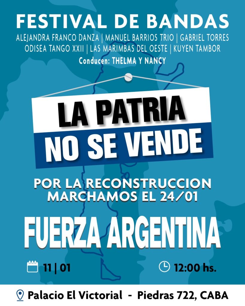“Fuerza Argentina” convoca al Festival de Bandas “La Patria no se vende”, evento que se llevará a cabo el jueves 11 de enero a las 12hs en el emblemático Palacio El Victorial, ubicado en Piedras 722, Ciudad Autónoma de Buenos Aires. Durante el encuentro, se entregarán 1000 viandas para las personas que están en situación de calle.