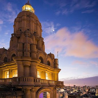 El Palacio Salvo es la construcción más icónica de la ciudad de Montevideo. Fue edificado por los hermanos empresarios Salvo, diseñado por el arquitecto italiano Mario Palanti e inaugurado el 12 de octubre de 1928. Con 105 metros de altura fue la segunda torre más alta de Sudamérica de 1928 hasta 1935. Originalmente sobre su cúpula funcionaba un faro que iluminaba simbólicamente la entrada al Río de la Plata, aunque su brillo duró poco.