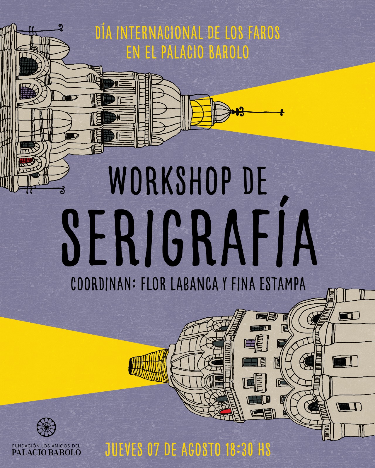 Una vez finalizada la charla, se desarrollará en el Espacio Barolo -piso 16- un workshop de serigrafía a cargo de la artista plástica Flor Labanca, donde los participantes podrán estampar sus imágenes del Faro del Palacio Barolo, al tiempo que disfrutan de una copa de vino.