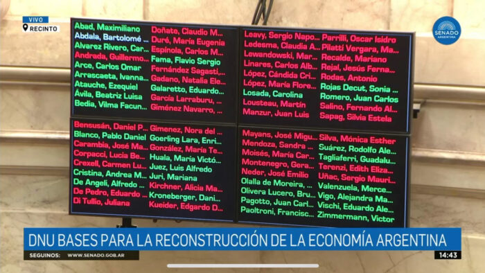 El Decreto de Necesidad y Urgencia (DNU) 70/2023 fue rechazado hoy por el Senado de la Nación por 42 votos negativos, 25 afirmativos y 4 abstenciones, unresultado que aumenta la tensión entre el Gobierno nacional y el Congreso de la Nación, luego de la reunión que se realizó hace poco menos de una semana entre los gobernadores y referentes del Poder Ejecutivo, en la Casa Rosada.