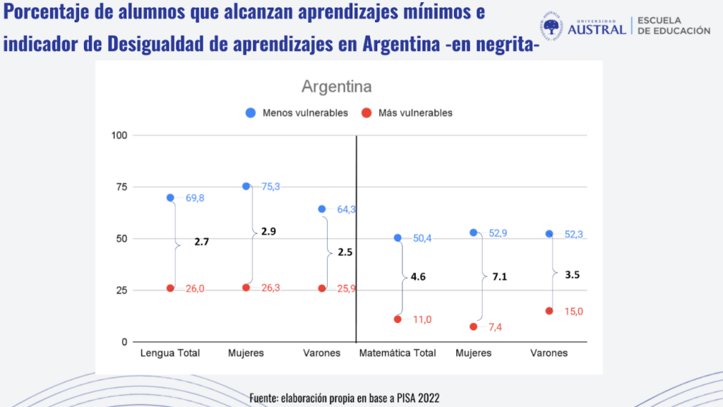 El dato más preocupante para el caso argentino surge al analizar los desempeños en Matemática: sólo el 7,4% de las adolescentes del quintil más bajo alcanza los aprendizajes mínimos, mientras que el 52,9% del quintil más alto sí lo logra. Esta diferencia de 7,1 a 1 no solo representa una profunda desigualdad dentro del país, sino que es la más alta registrada entre los países analizados.