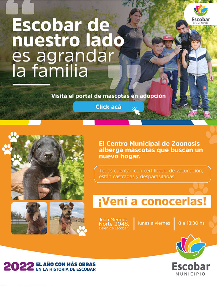 El Centro Municipal de Zoonosis “Doctor Ricardo Augusto Godnic” alberga mascotas que buscan un nuevo hogar. Si estás interesado en adoptar una podés acercarte al centro y conocerlas. Todas cuentan con certificado de vacunación, están castradas y desparasitadas.