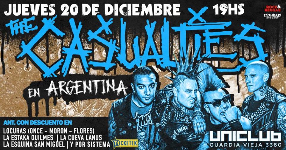 Directo de Nueva York llegan los reyes del Street Punk! THE CASUALTIES en Argentina! The Casualties regresa para presentar su reciente disco “Written in Blood”, editado por el sello Cleopatra. Desembarcarán en Buenos Aires, en medio una gira latina llamada “Ya Basta” y que incluye presentaciones en Mexico, Colombia, Chile y Paraguay. Será la primera vez por estas tierras con su nuevo e increíble cantante, Dave Rodríguez, quien reemplaza a Jorge Herrera quien hace mas de un año abandonó al grupo luego de 27 años. JUEVES 20 DE DICIEMBRE THE CASUALTIES EN UNICLUB |