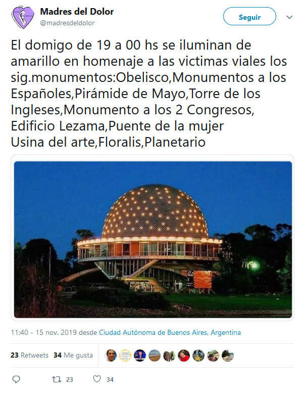 Además, este domingo a las 19 se iluminarán de amarillo en homenaje a las victimas viales monumentos porteños como el Obelisco, el Monumento a los Españoles, la Pirámide de Mayo, la Torre de los Ingleses, el Monumento a los Dos Congresos, el Edificio Lezama, el Puente de la Mujer, la Usina del Arte, la Floralis y el Planetario.