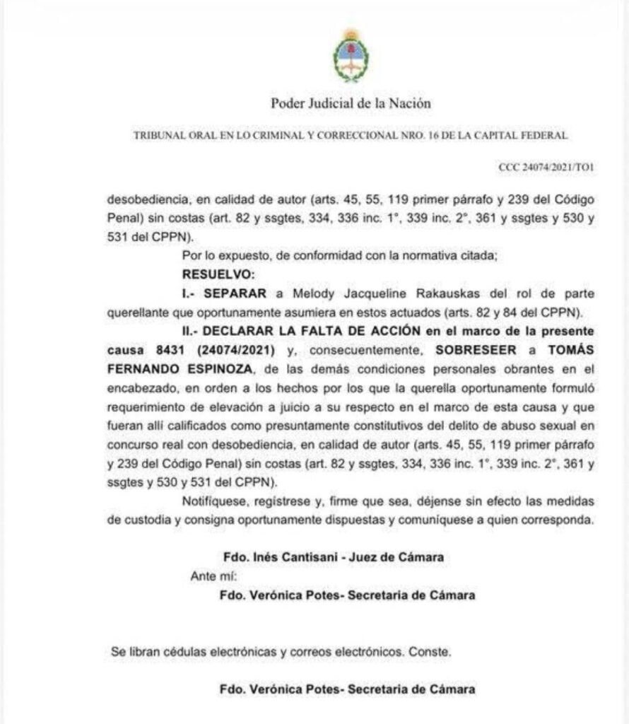 La denunciante, Melody Rakauskas, no pudo sostener la acción penal. La Jueza Inés Cantisani primero la apartó en su rol de querellante y luego, decidió dejar sin efecto el expediente.