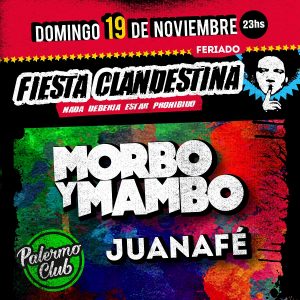 El domingo 19 de noviembre (Lunes Feriado), llegan Morbo&Mambo y Juanafé a la Fiesta Clandestina en Palermo Club (Borges 2450). Entradas a la venta a través de Ticketek y en los lugares de siempre.