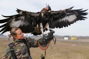 Para protegerlas de posibles heridas, equipan a las águilas con «guantes» de cuero. Jamás arriesgaría la vida de un ave «que quiero profundamente», advierte el halconero.