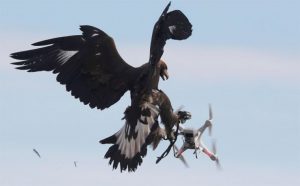 Inmediatamente, un graznido estridente cubre el ruido de su motor. Un águila, soltada desde la torre de control a 200 metros de distancia de allí, se abalanza a toda velocidad sobre el aparato. En apenas veinte segundos derriba a su presa. Con el dron neutralizado, termina el entrenamiento.