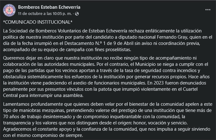 “La Sociedad de Bomberos Voluntarios de Esteban Echeverría rechaza enfáticamente la utilización política de nuestra institución por parte del candidato a diputado nacional Fernando Gray, quien irrumpió en el Destacamento N.º 1 de 9 de Abril sin aviso ni coordinación previa, acompañado de su equipo de campaña con fines proselitistas”, advierte el comunicado.