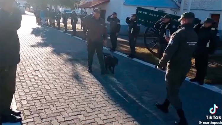 Finalmente, el Comandante Principal expresó: «Feliz retiro, compañera», notoriamente conmovido. El gendarme que acompañaba a la perra se emocionó hasta las lágrimas mientras escuchaba al gendarme y acarició en todo momento a Peki, al mismo tiempo que la besaba.