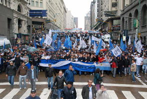 La Federación Gremial del Personal de la Industria de la Carne y sus derivados, liderada por José Alberto Fantini, realizó está tarde una masiva manifestación por el centro porteño que culminó frente a la sede de la cartera laboral en Alem al 600. Calificada como una movilización “histórica”, los gremialistas superaron sus expectativas, convocando a más de 5000 trabajadores, que llegaron de los 50 sindicatos afiliados. Fantini logró el compromiso del Ministro de Trabajo, Carlos Tomada de “garantizar las 200 horas mensuales con lo colaboración de los empresarios o no” para los trabajadores de la carne. “No marchamos en busca de un subsidio sino como una representación genuina del descontento que hoy viven mis trabajadores por no cumplir con sus tareas normales en los frigoríficos”.