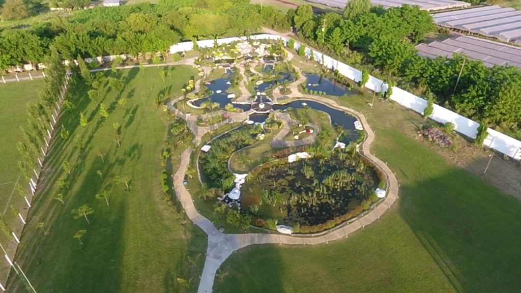 Además se destaca el imponente lago artificial de 2.500 m2 diseñado por el paisajista japonés Oscar Nakandakare, que cuenta con una cascada iluminada de 5 metros de altura y dos islas, a través de la cuales los visitantes podrán recorrer sus senderos y puentes, llenos coloridos árboles, arbustos y plantas.
