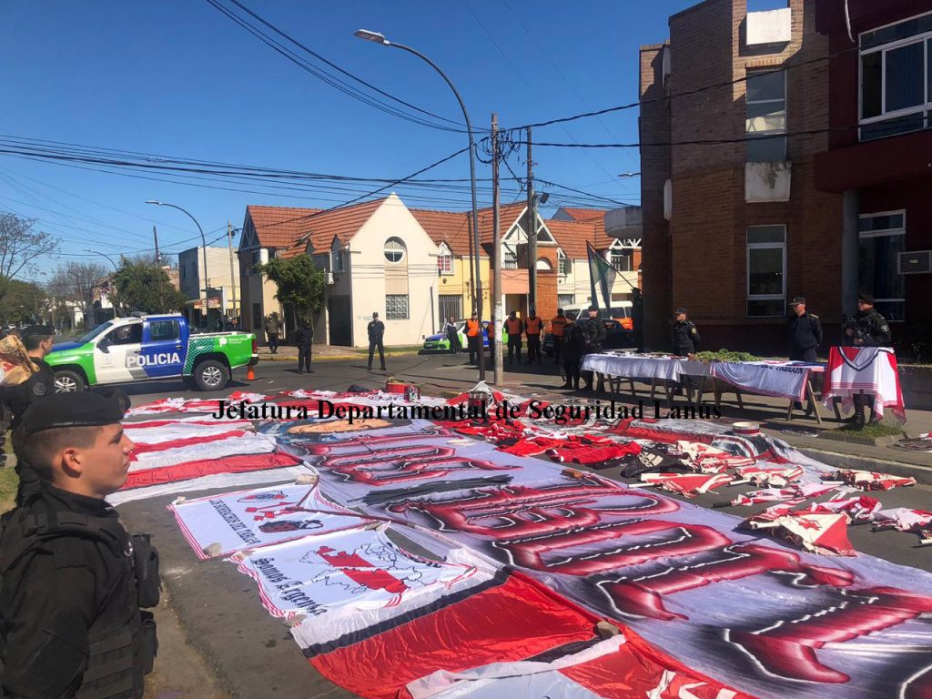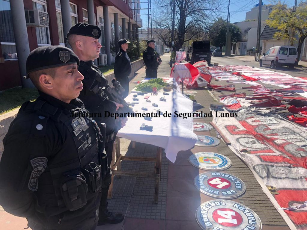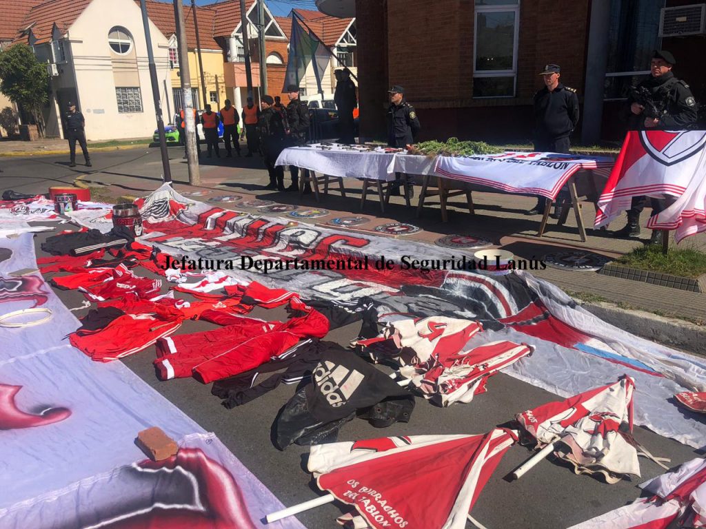 Una de las armas incautadas tiene el grabado de la Policía Federal Argentina, además los efectivos secuestraron 25 envoltorios de cocaína y 4 de marihuana, una balanza de precisión, cuatro teléfonos celulares, dos banderas de tres metros y medio de largo con la inscripción “Los borrachos del tablón”, 16 banderas chicas con la misma inscripción, 16 paraguas, 22 banderas con caños de pvc, 66 camisetas, 14 camperas, una remera con el estampado de la facción, tres gorras y 3 bombos con la inscripción “Los 14” en referencia a la barra brava.
