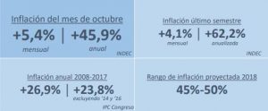 En los últimos seis meses la suba de los precios llegó a 27,4%, superando la inflación anual promedio de los últimos diez años (+27%). De esta manera, la inflación del último semestre fue 4,1% promedio por mes, lo que equivale a un incremento anualizado de 62%. Como resultado de la marcada aceleración inflacionaria de los últimos meses, en octubre los precios acumularon un alza de 45,9% respecto de doce meses atrás.