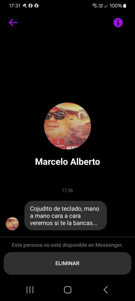 Incluso uno de estos que agredía a otros que criticaron a Jey Mammón, cuando le pedí que expusiera sus fundamentos ya que además de mentir desconocía sobre el tema, se ofendió me bloqueo y me escribió en privada para amenazar, así de ridículos y peligrosos son, si sos amigo del usuario Marcelo Alberto en Facebook y tenés hijos menores no los dejes cerca.
