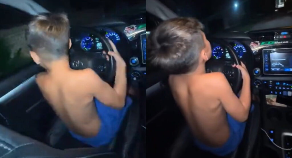 En las imágenes se observa al pequeño en cuero y con un short azul, conduciendo a alta velocidad por una calle a oscuras y con la música alta. “Pégale una pisadita a ver qué onda”, le dice el mayor al pequeño, quien le hace caso y vuelve a acelerar.