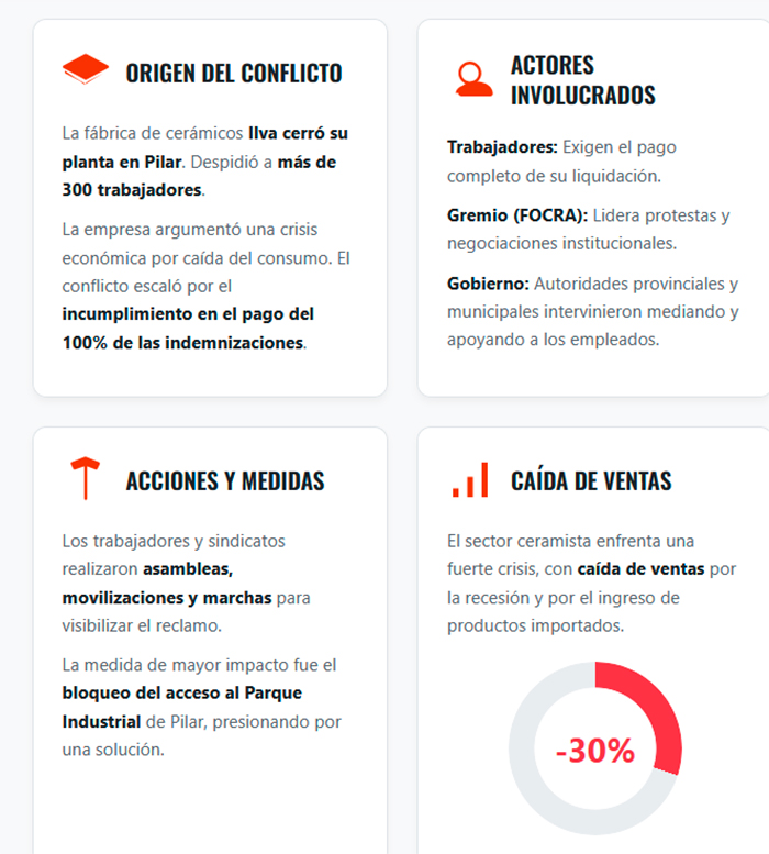 El caso Ilva se inscribió en una crisis más amplia para la industria cerámica. El sector enfrentó una retracción en la venta de productos para la construcción y un aumento de la competencia importada. Las ventas cayeron entre 25% y 30%, mientras los precios retrocedieron en un mercado deprimido. Los altos costos energéticos completaron un cuadro que complicó la ecuación de costos y márgenes.