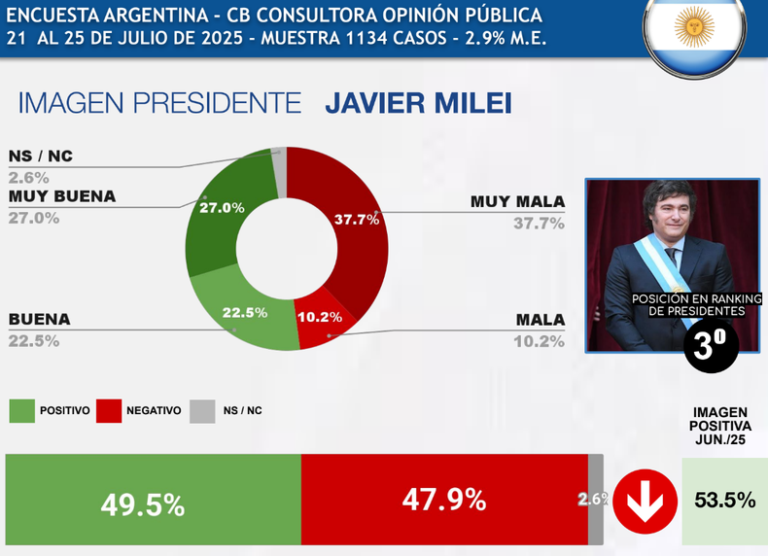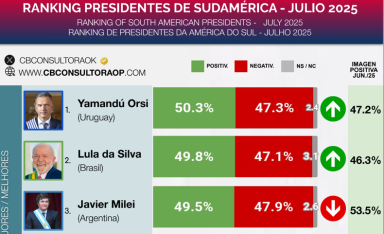 Los datos surgen de un informe mensual elaborado por CB Consultora, que mide la imagen de los presidentes sudamericanos. En junio, Milei había encabezado el ranking con un 53,5%, pero en julio su apoyo bajó cuatro puntos.