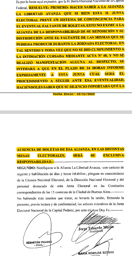 La Justicia Electoral realizó el primer aviso el 12 de noviembre debido al faltante de boletas y le recordó al partido de La Libertad Avanza que el estado financió su impresión con una transferencia de 260 millones de pesos.